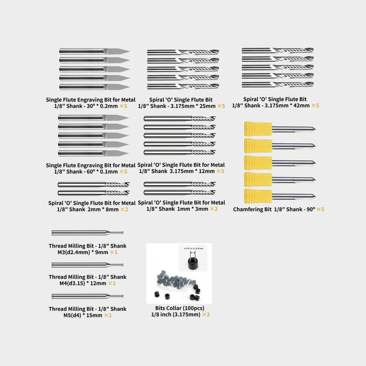 Las herramientas son compatibles con Carvera Air, Carvera Pro y otras máquinas CNC de escritorio que usan pinzas de 1/8" o 6 mm.
