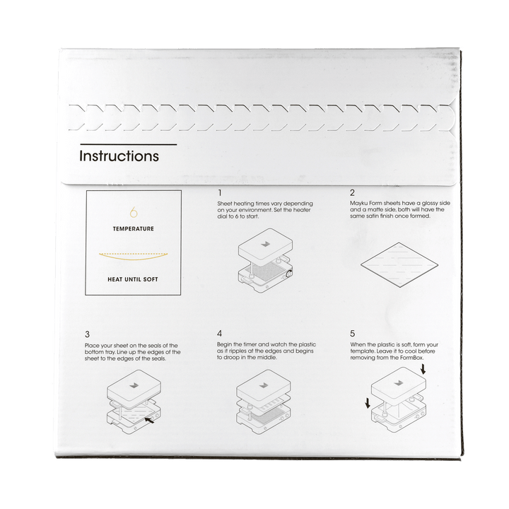 Las Hojas de Molde Mayku FormBox están especialmente diseñadas para la Mayku FormBox y ofrecen una superficie satinada duradera para proyectos creativos y funcionales. Con un grosor de 0,5 mm, las planchas son perfectas para empaques de productos, prototipos y manualidades decorativas. El material está parcialmente hecho de plástico reciclado y es 100 % reciclable, para resultados sostenibles sin compromisos.