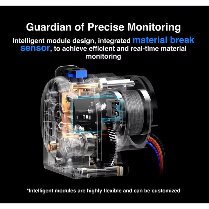 El APUS 2 está equipado con un sensor integrado de rotura de material y ofrece un diseño modular inteligente que permite una monitorización precisa en tiempo real del estado del material. Esta función asegura una alimentación de material fluida y mejora la precisión general de la impresión.