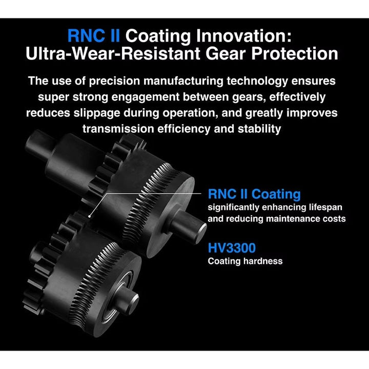 El innovador recubrimiento RNC II ofrece una capa protectora ultra duradera para los engranajes con una dureza de HV3300. Esto reduce el desgaste y minimiza el mantenimiento. Esta tecnología de precisión mejora el acoplamiento de los engranajes, minimiza el deslizamiento y aumenta considerablemente la eficiencia y la estabilidad operativa.