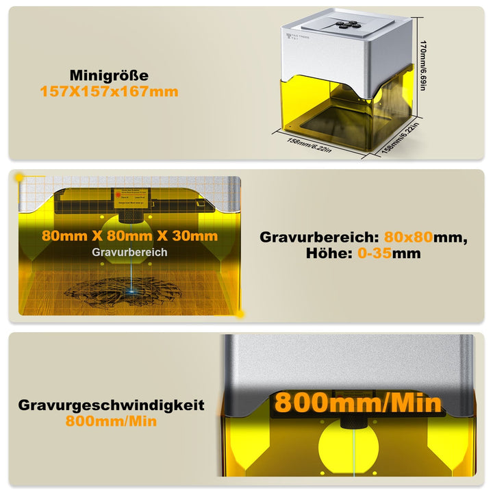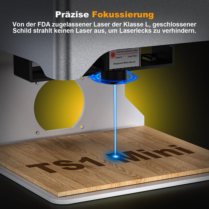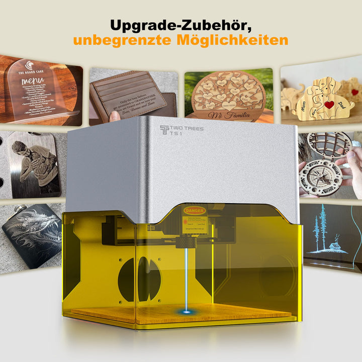 Con su láser azul de 455 nm, el TS1 Mini logra grabados nítidos en una gran variedad de materiales como madera, cuero, acrílico, cartón o metal recubierto. El área de trabajo de 100 × 100 mm es óptima para piezas personalizadas, etiquetas, colgantes o pequeñas series con gran detalle.