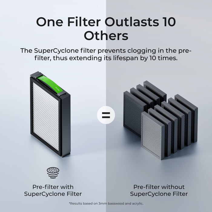 El corazón del AP2 es el sistema de filtro de 6 capas, que limpia el aire capturando polvo, alérgenos y vapores nocivos. El sistema incluye el filtro SuperCyclone para partículas grandes, un filtro de eficiencia media para polvo fino y una malla de carbono ultra densa que elimina olores y COVs con una eficiencia del 99,99 %. A pesar de sus potentes capacidades de filtración, el xTool SafetyPro AP2 funciona con solo 55 dB, lo que lo hace ideal para entornos residenciales o de oficina donde se deben minimizar los niveles de ruido.